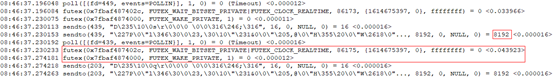 当有数据流通过的时候,接收端8KB大小的buffer很容易就被占满,这个时候流控线程会通知对端的发送线程进行休眠,等待应用将数据取走后,有足够大小的buffer了,再通知对端继续发送。如图8,通过strace追踪发送线程与内核之间的交互可以看到,每一次发送端发送8192byte的数据后都会等待被唤醒,其间耗费了大量的时间,导致通信的性能慢。