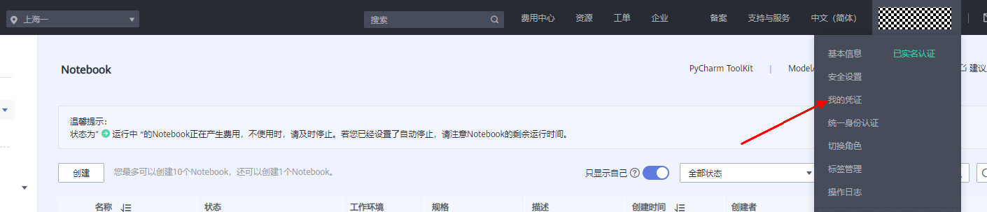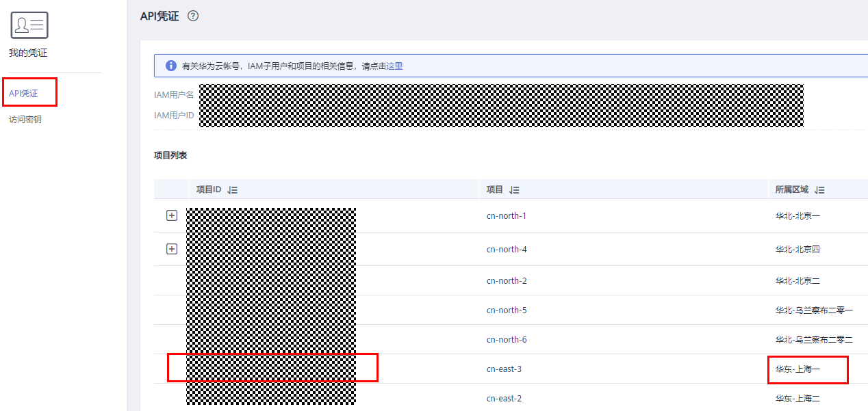 在API凭证页面获取当前使用区域的projectid。例如我在上海一使用,那么就获取上海一的projectid