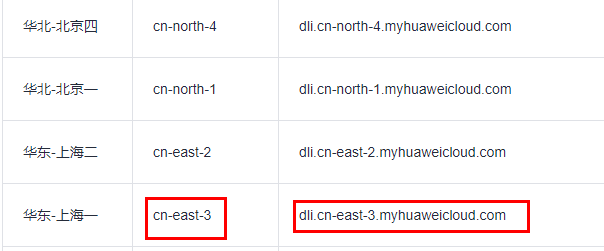 例如我想使用的上海一那么endpoint就是 dli.cn-east-3.myhuaweicloud.com