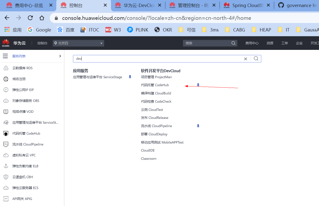 首先通过控制台,进入DevCloud的CodeHub。
