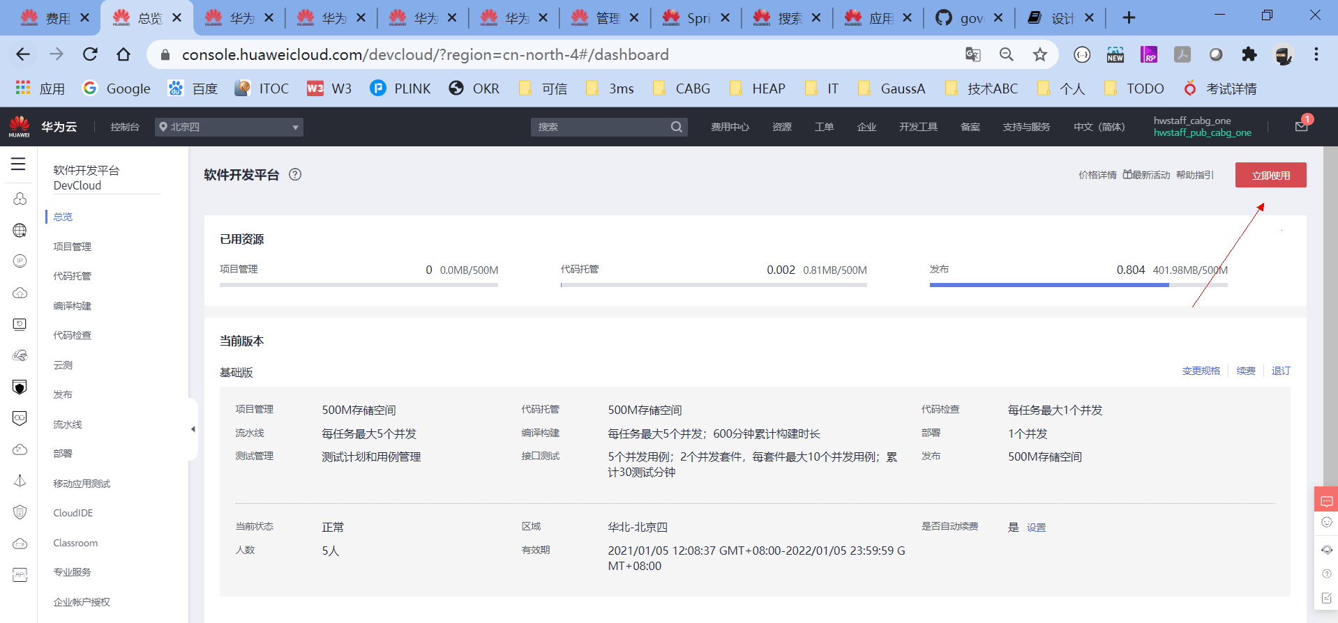 选择右上角的“立即使用”,即可进入华为云DevCloud。