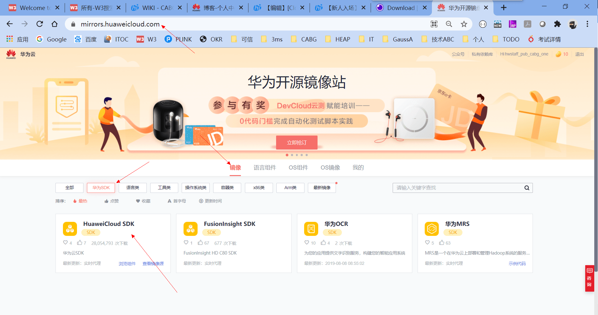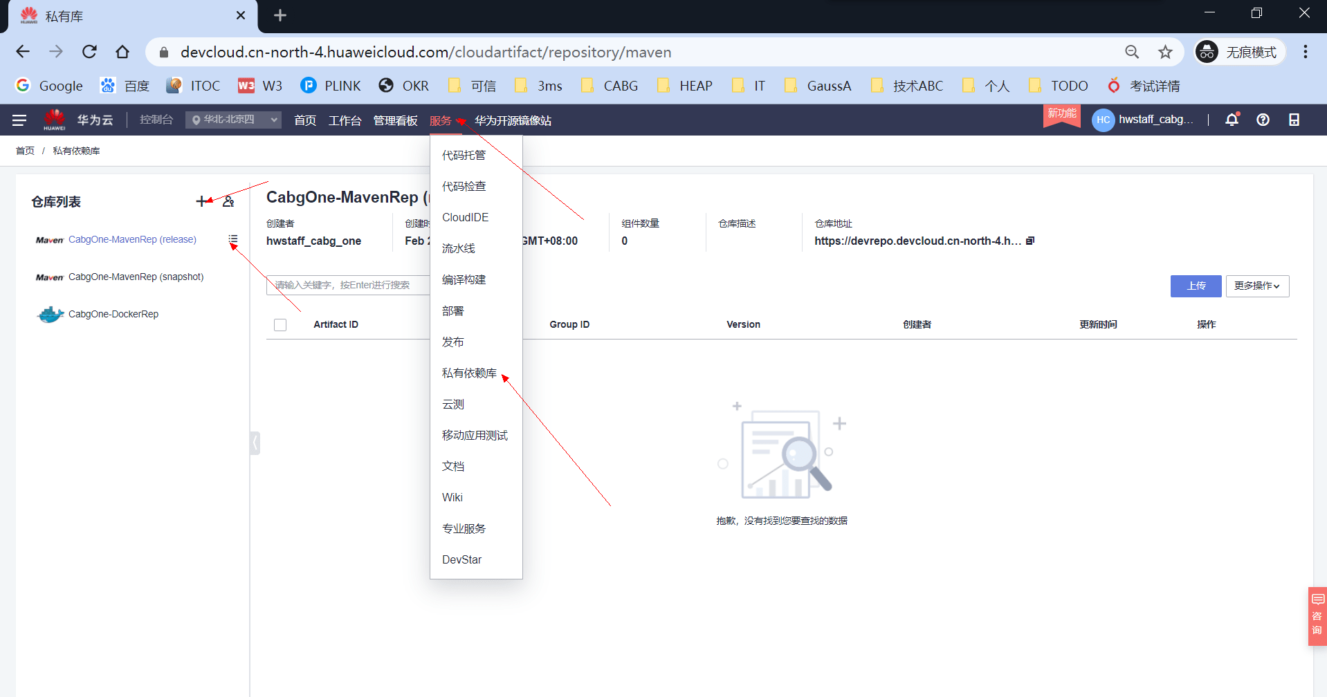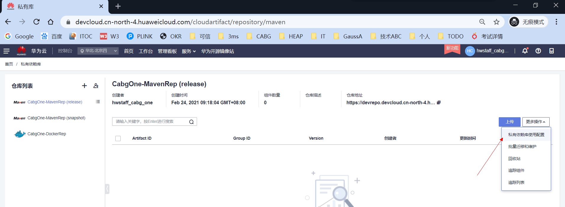 如果用了DevCloud的私有镜像仓,比如自己有一些本地包,需要上传,供其他项目拉取,需要到DevCloud中创建,入口链接