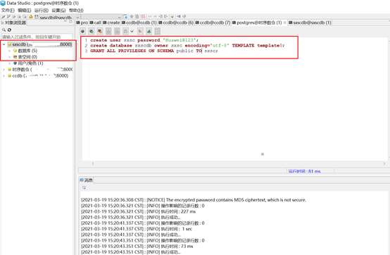 | --创建用户 create user sxsc password 'Huawei@123'; --创建数据库 create database sxscdb owner sxsc encoding='utf-8' TEMPLATE template0; --赋予用户sxsc 模式public权限 GRANT ALL PRIVILEGES ON SCHEMA public TO sxsc; |