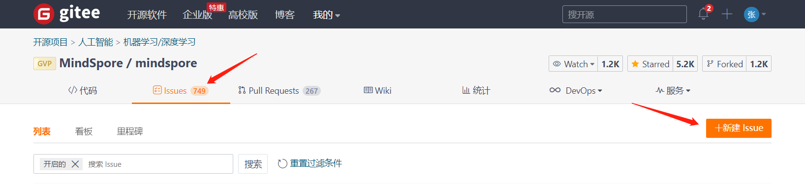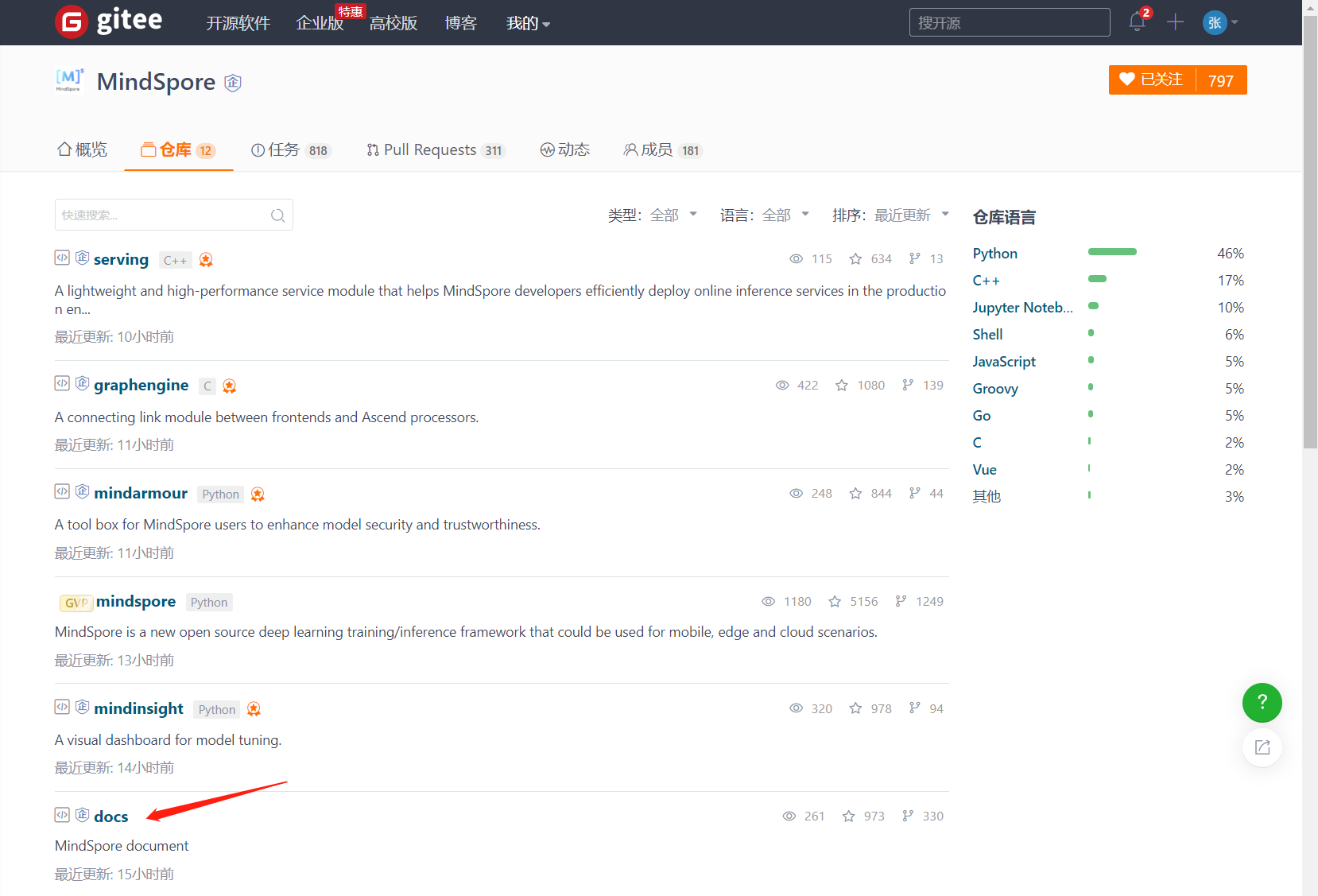 点击MindSpore的“仓库” https://gitee.com/organizations/mindspore/projects