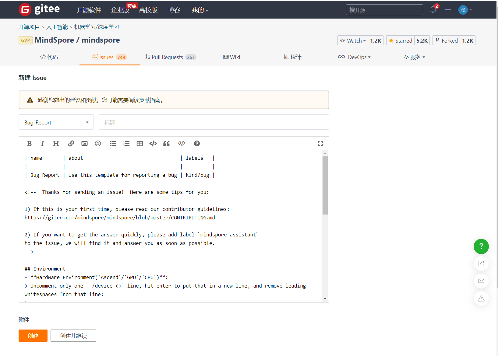 点击 代码右边的 Issues(如箭头所示),再点击右边的 “+新建 Issue”按钮。系统会弹出以下界面: