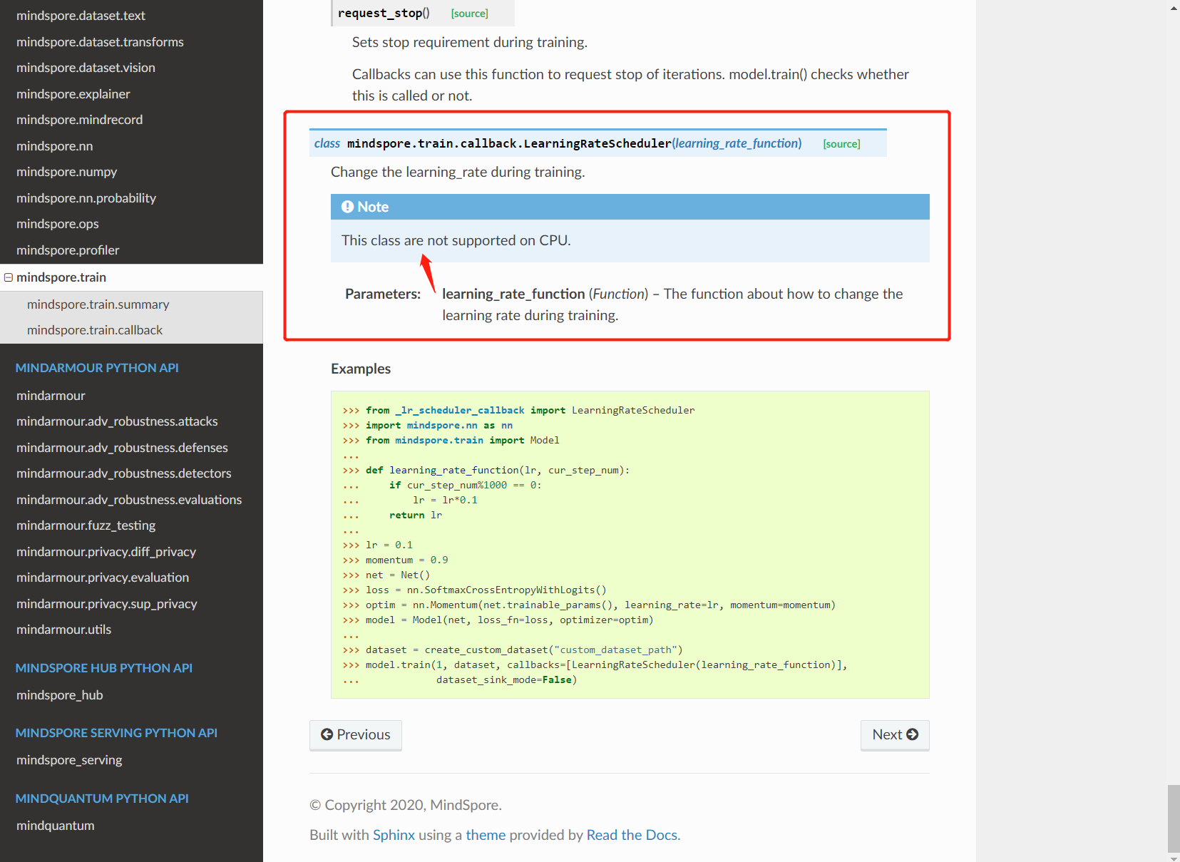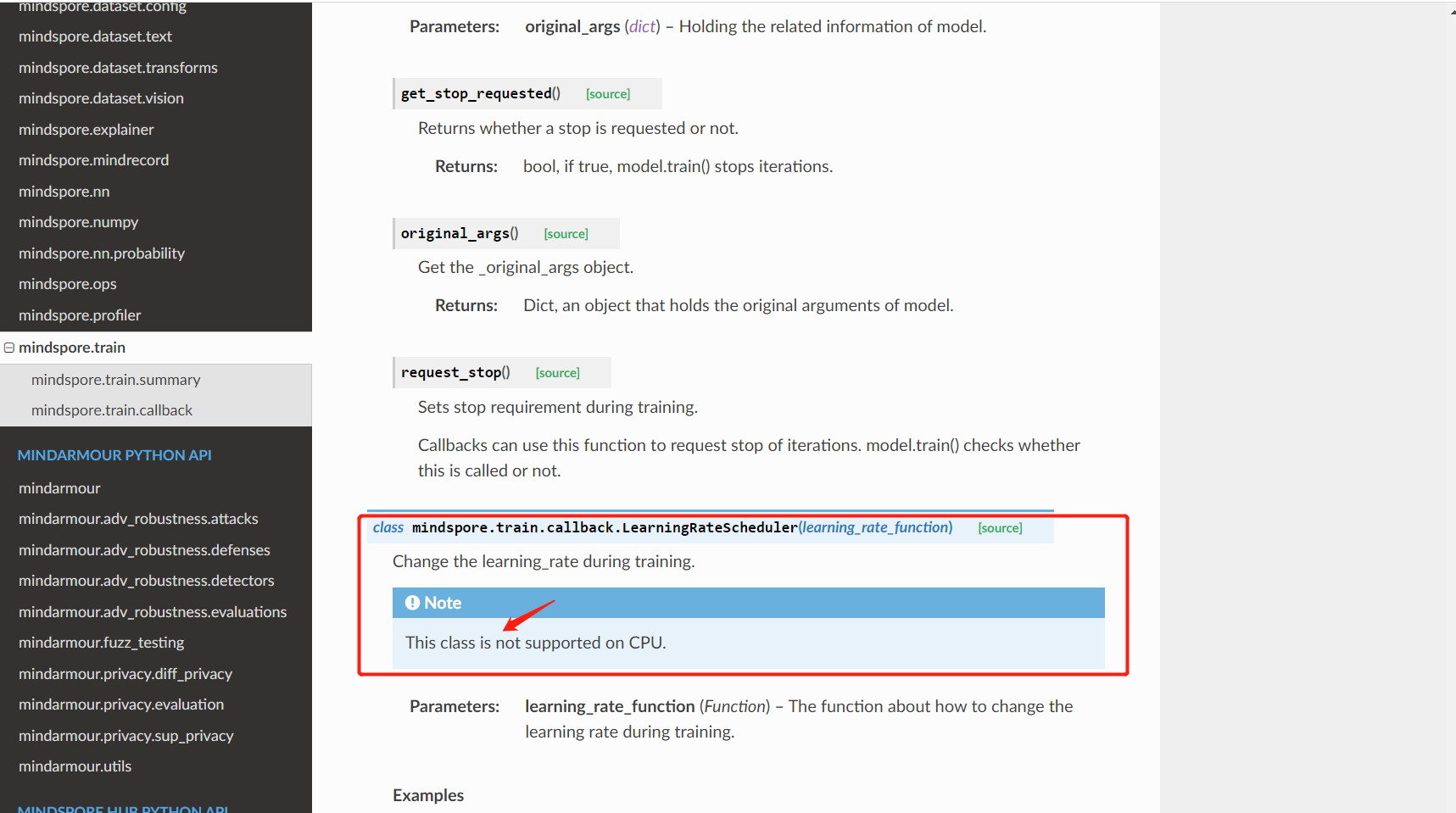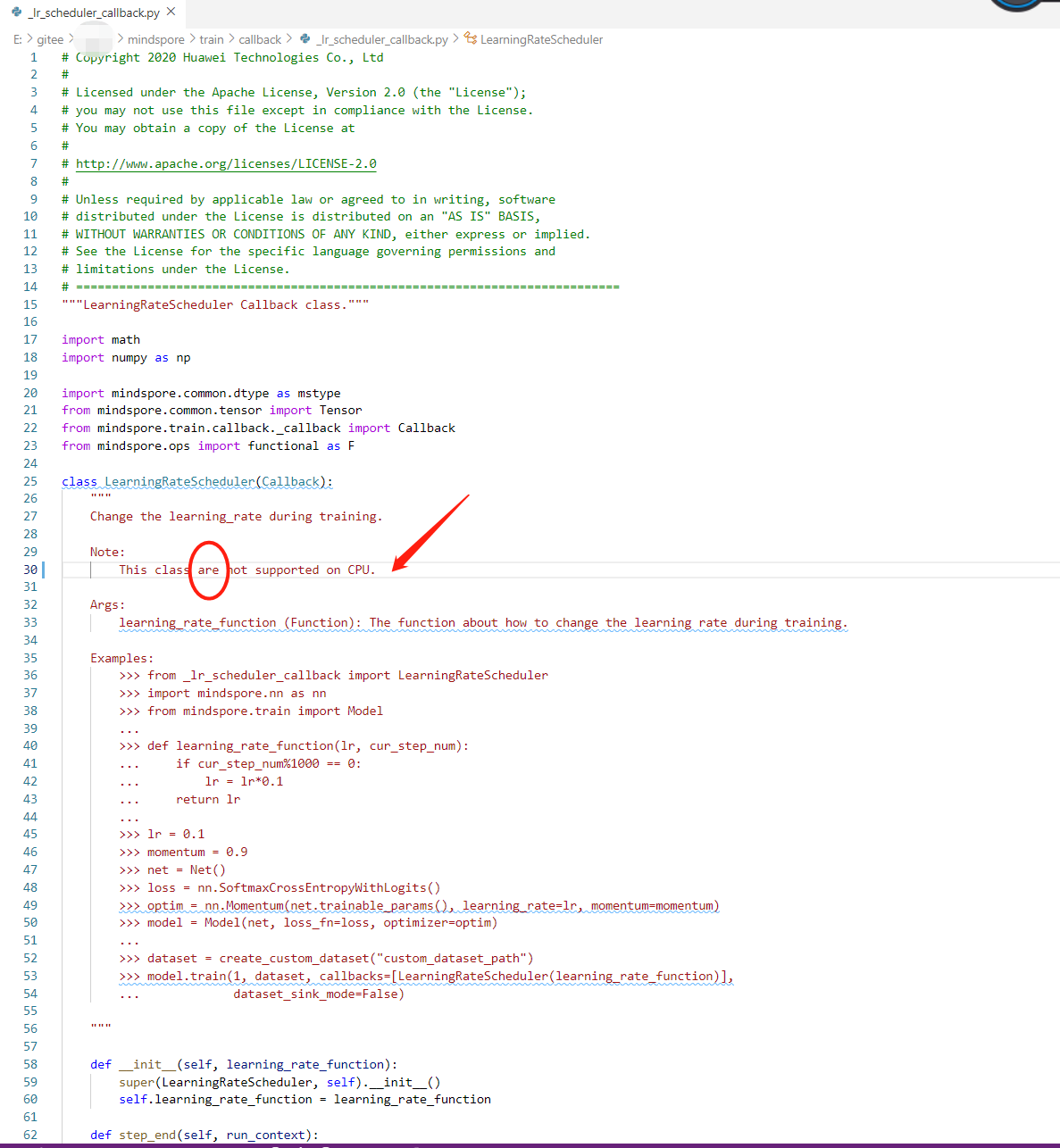 会发现 class mindspore.train.callback.LearningRateScheduler(learning_rate_function) 这个类的Note中,"This class are not supported on CPU." 存在一个语法错误,我们知道class作为类的名词,是单数。