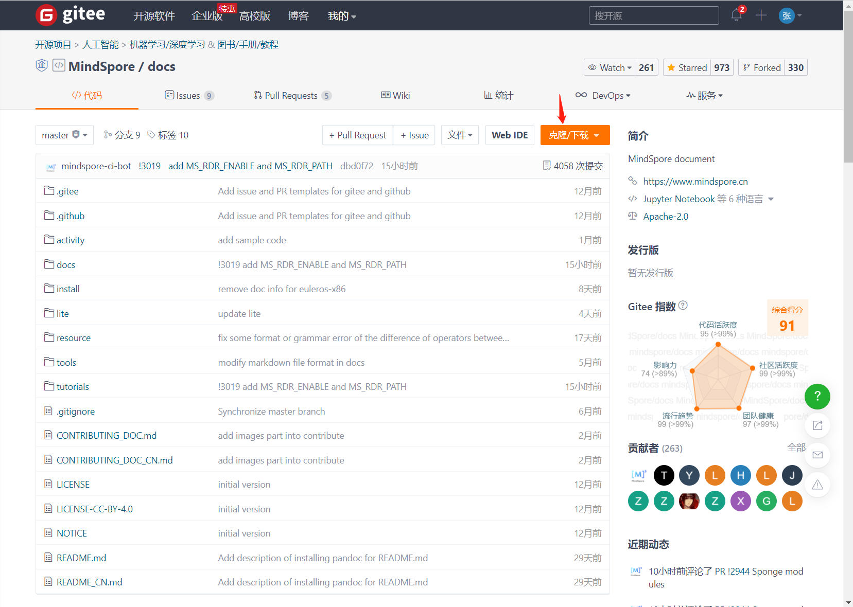 点击“克隆/下载””,找到docs仓库的下载地址(HTTPS): https://gitee.com/mindspore/docs.git
