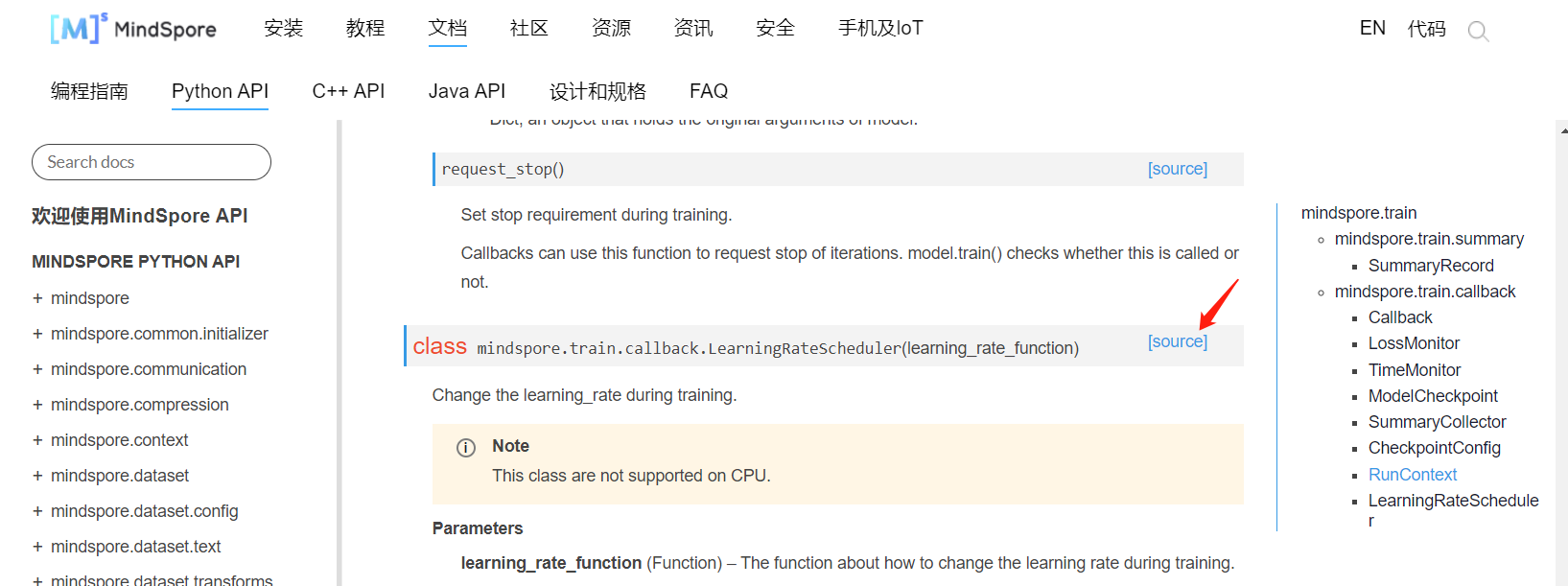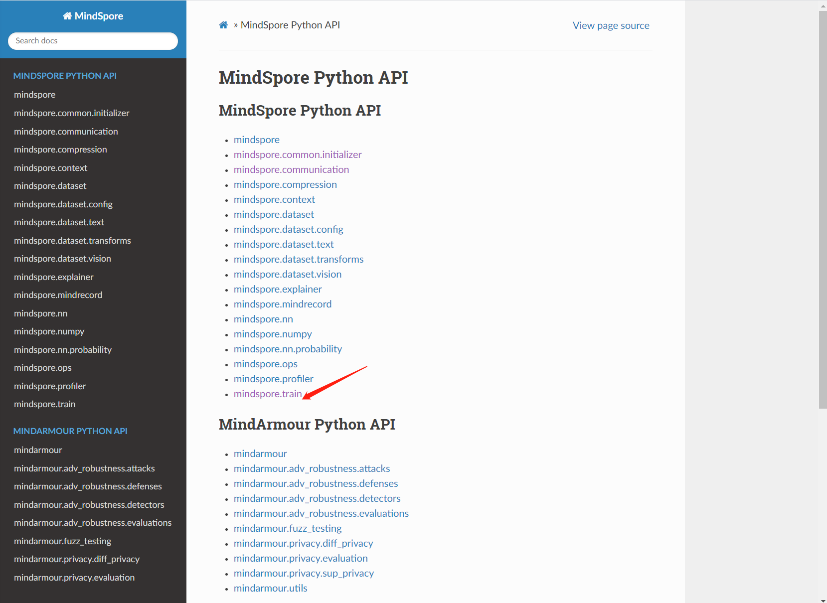 https://www.mindspore.cn/doc/api_python/zh-CN/master/mindspore/mindspore.train.html ,函数右边有个“source”,标明了文档对应代码的位置,点击这个"source"