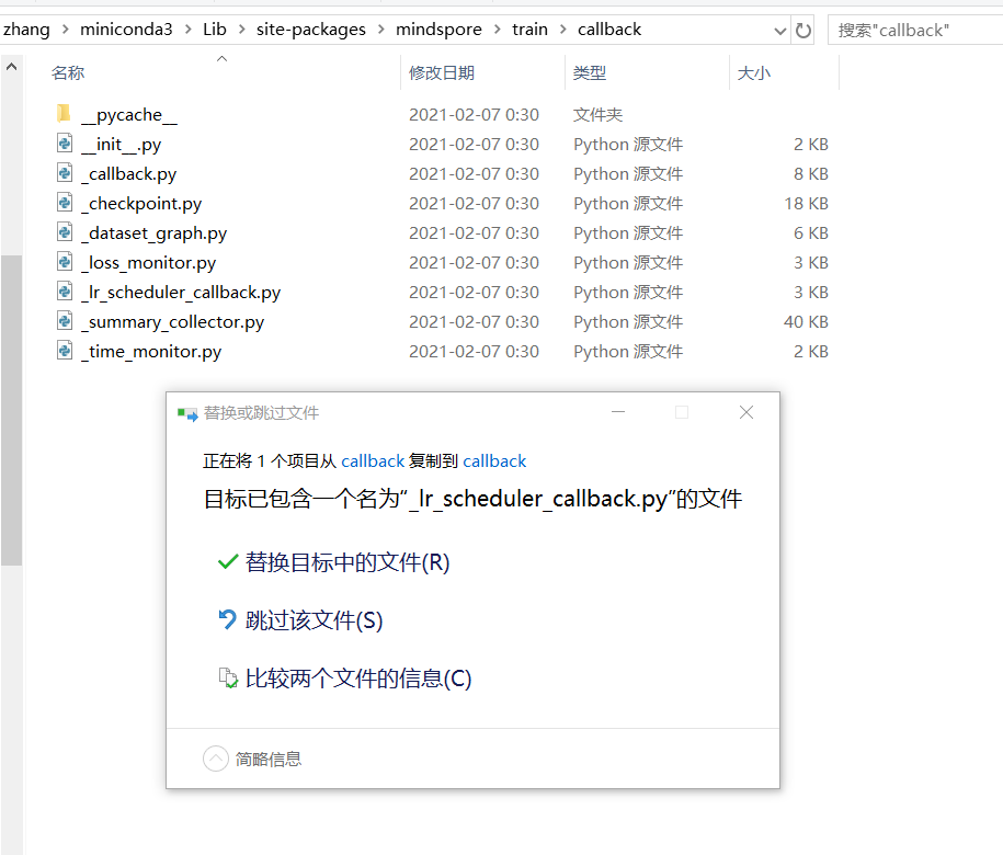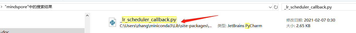 张小白已经安装好的mindspore在 C:\Users\zhang\miniconda3\Lib\site-packages\mindspore\ 目录下。(可以通过搜索找 _lr_scheduler_callback.py 文件)