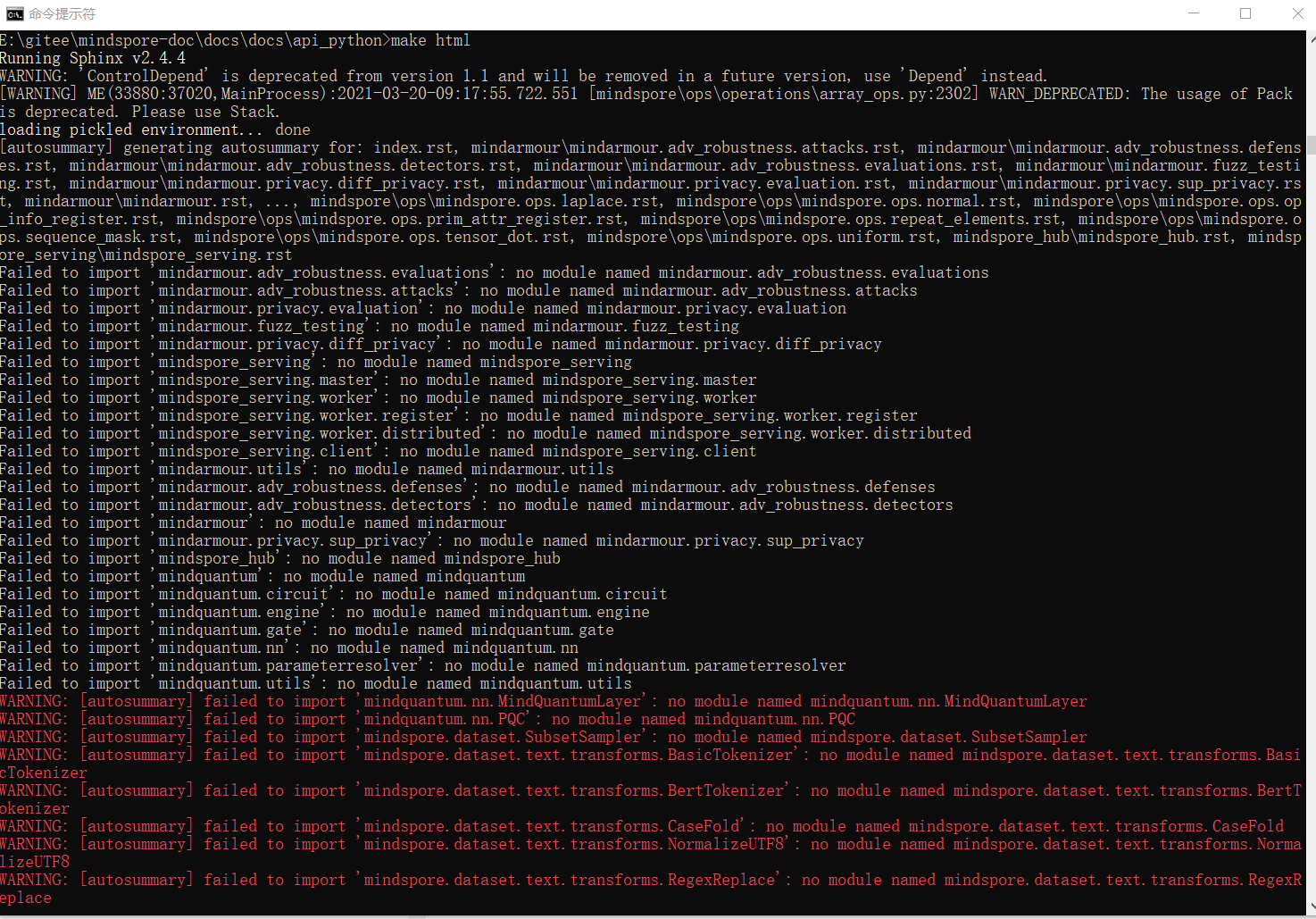 注释掉仓库下docs\api_python\source_en\conf.py和docs\api_python\source_zh_cn\conf.py代码中的几个import,以便让编译通过(当然此时仅仅能生成mindspore的Python API文档,应该生成不了mindarmour,mindspore_hub或者mindspore_serving的API文档了。)