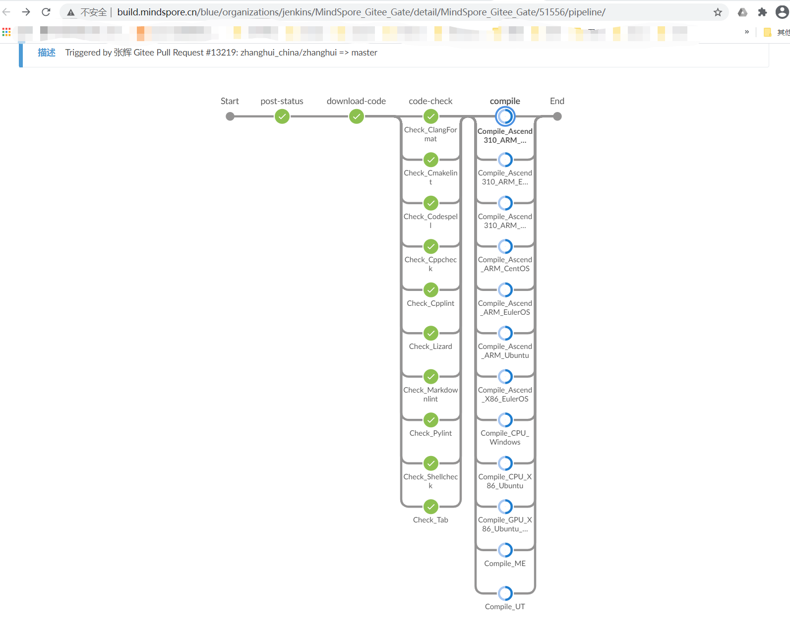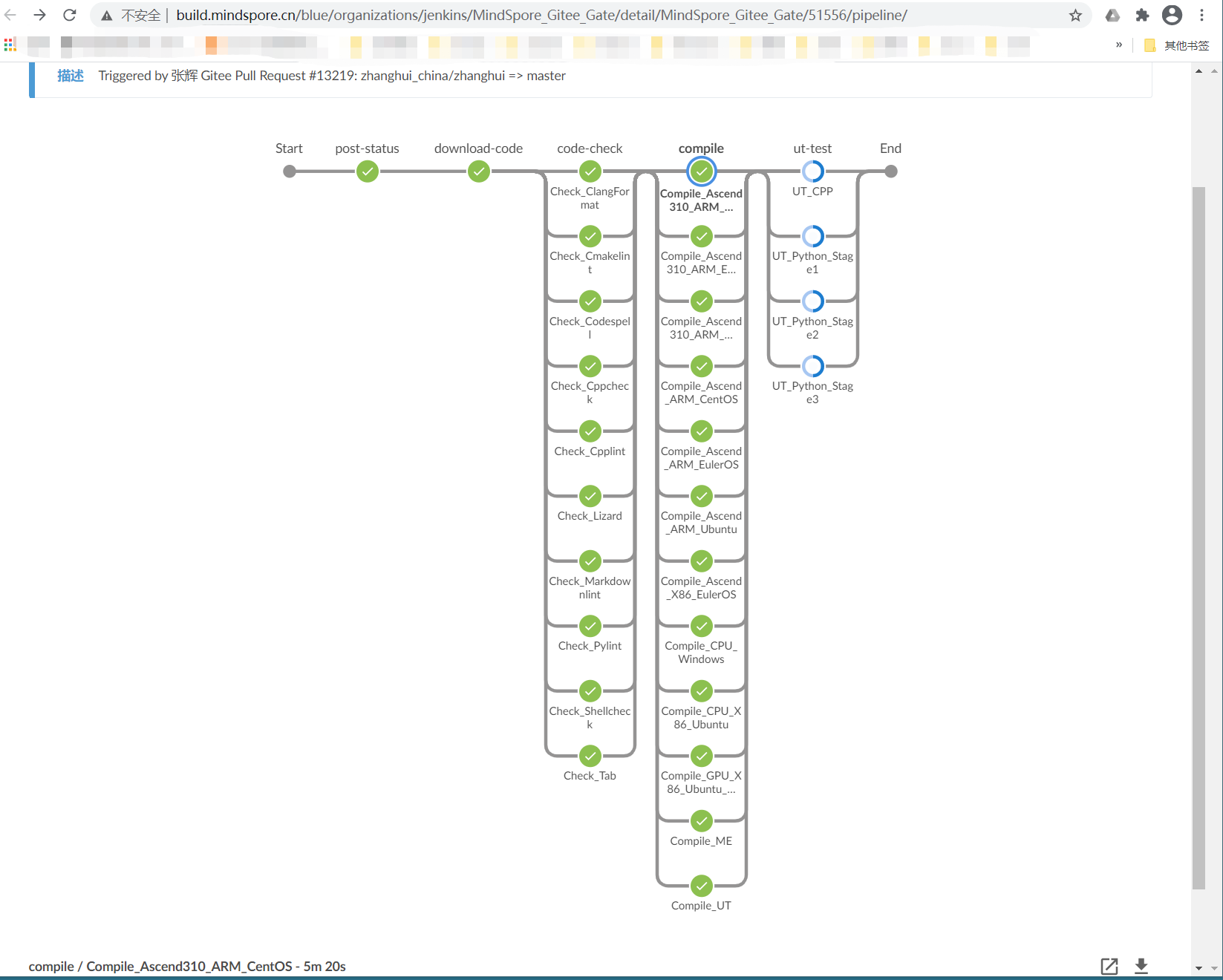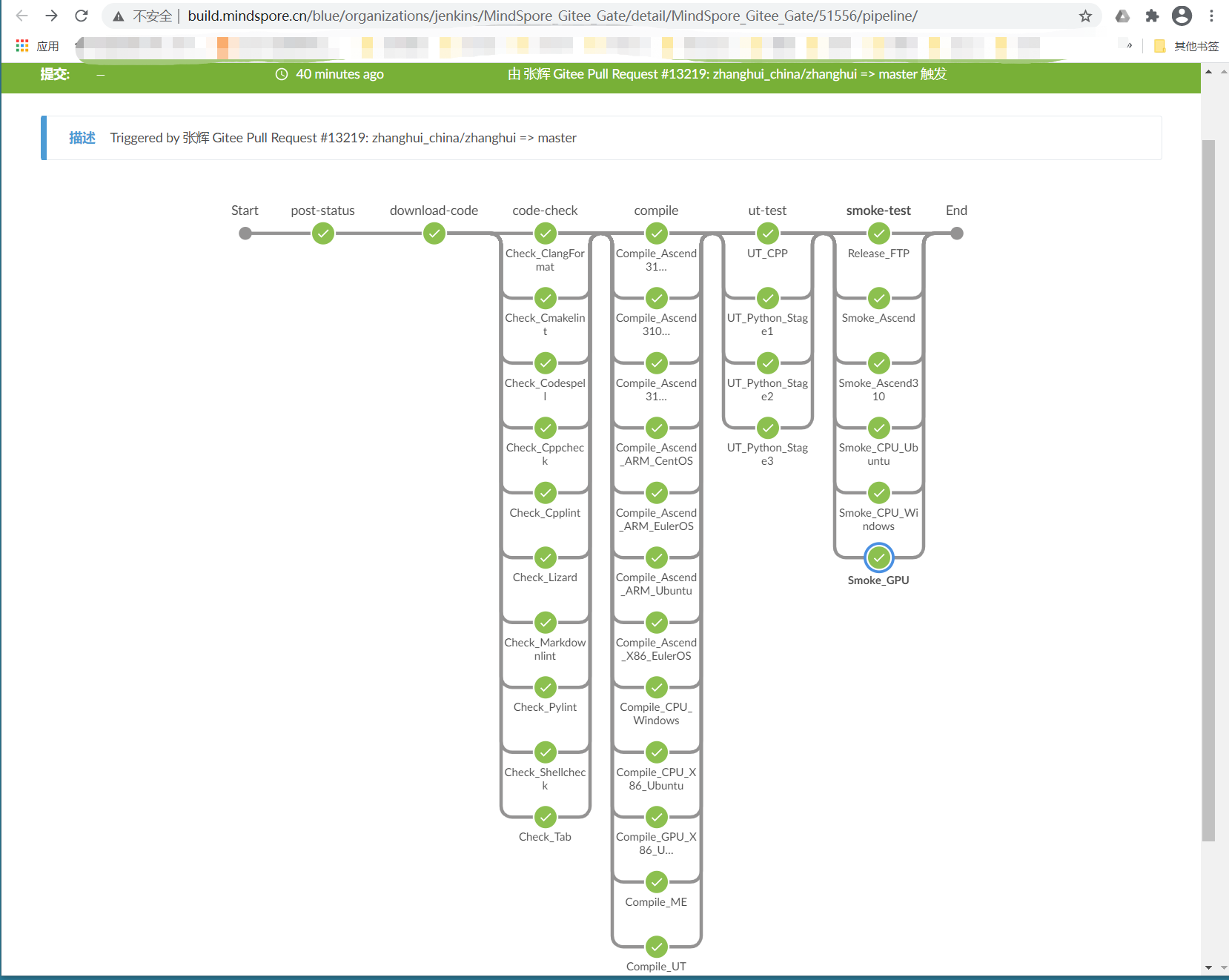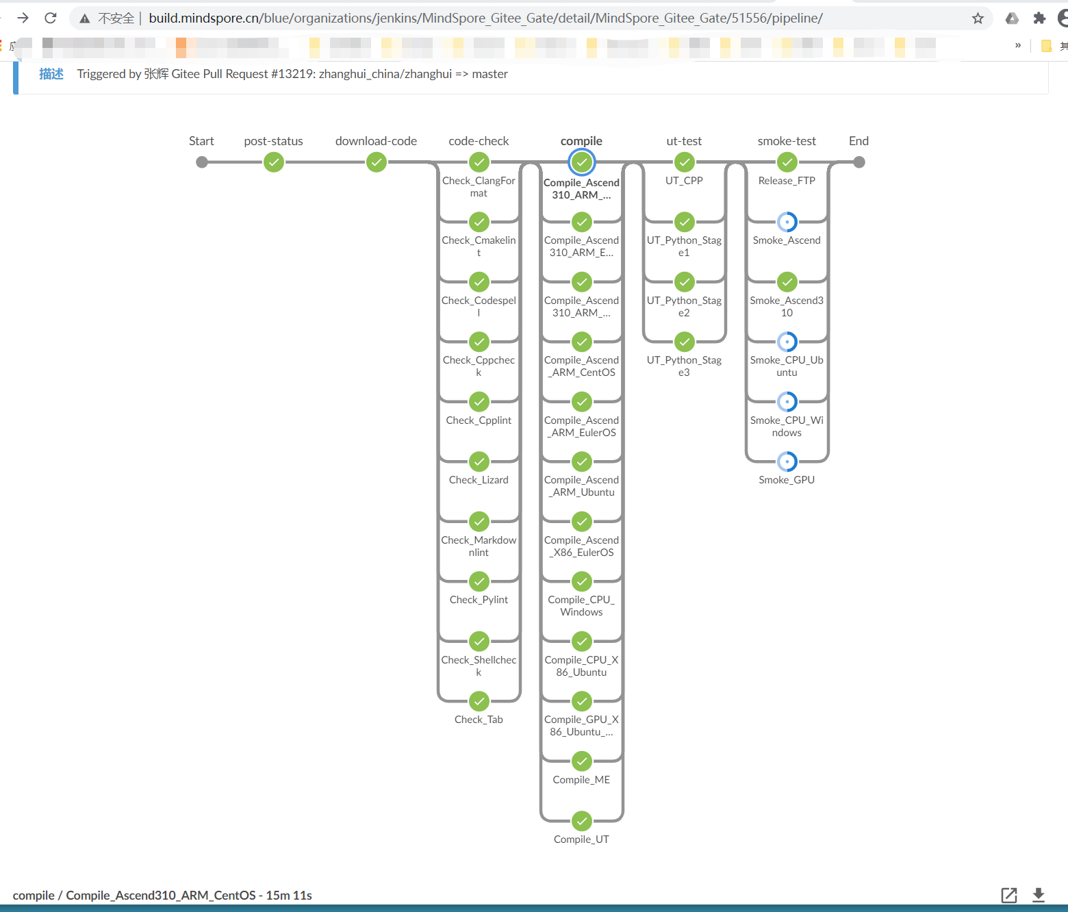 从上面的过程可以看出,云端的测试包含 代码下载download-code,代码检查code-check,代码编译compile,ut-test,冒烟测试smoke-test等过程。虽然仅有一行代码的改动,但是mindspore-ci-bot 还是把各种环境都编译测试了一遍。所以这段测试时间历时也会比较长,一般在一小时左右。