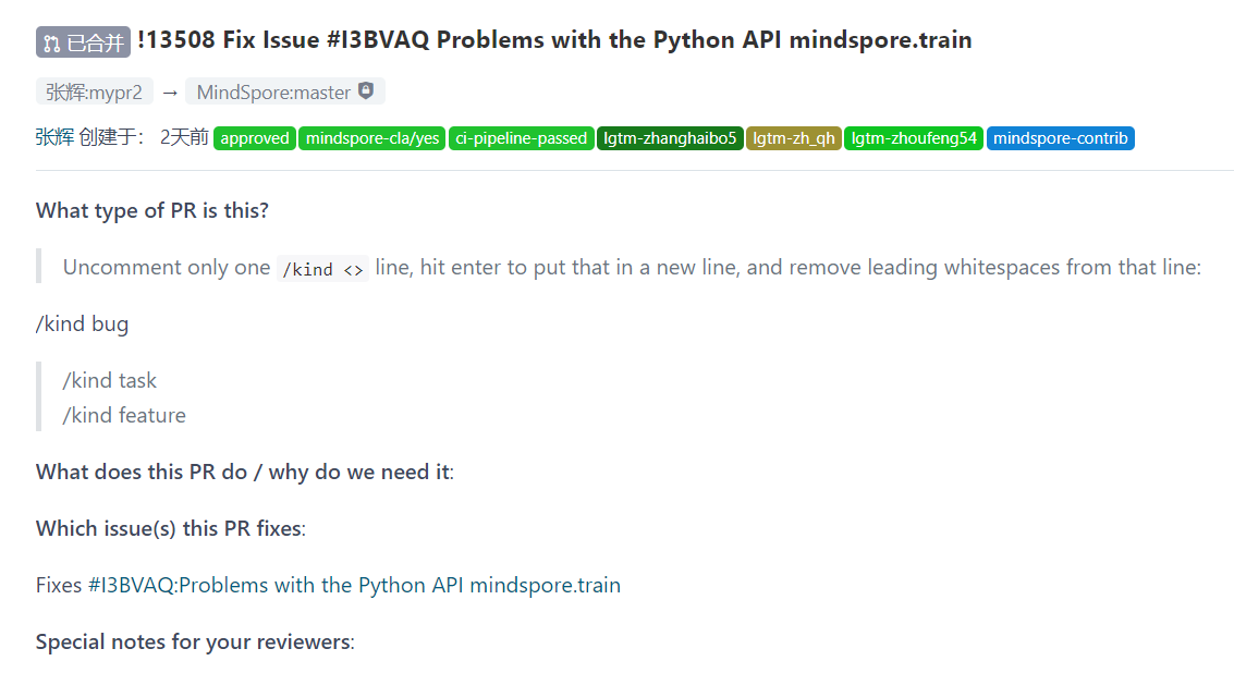 好像就需要填这三个地方:标题,对应issue和标签(Mindspore的Python API文档修改可以增加 mindspore-contrib标签)