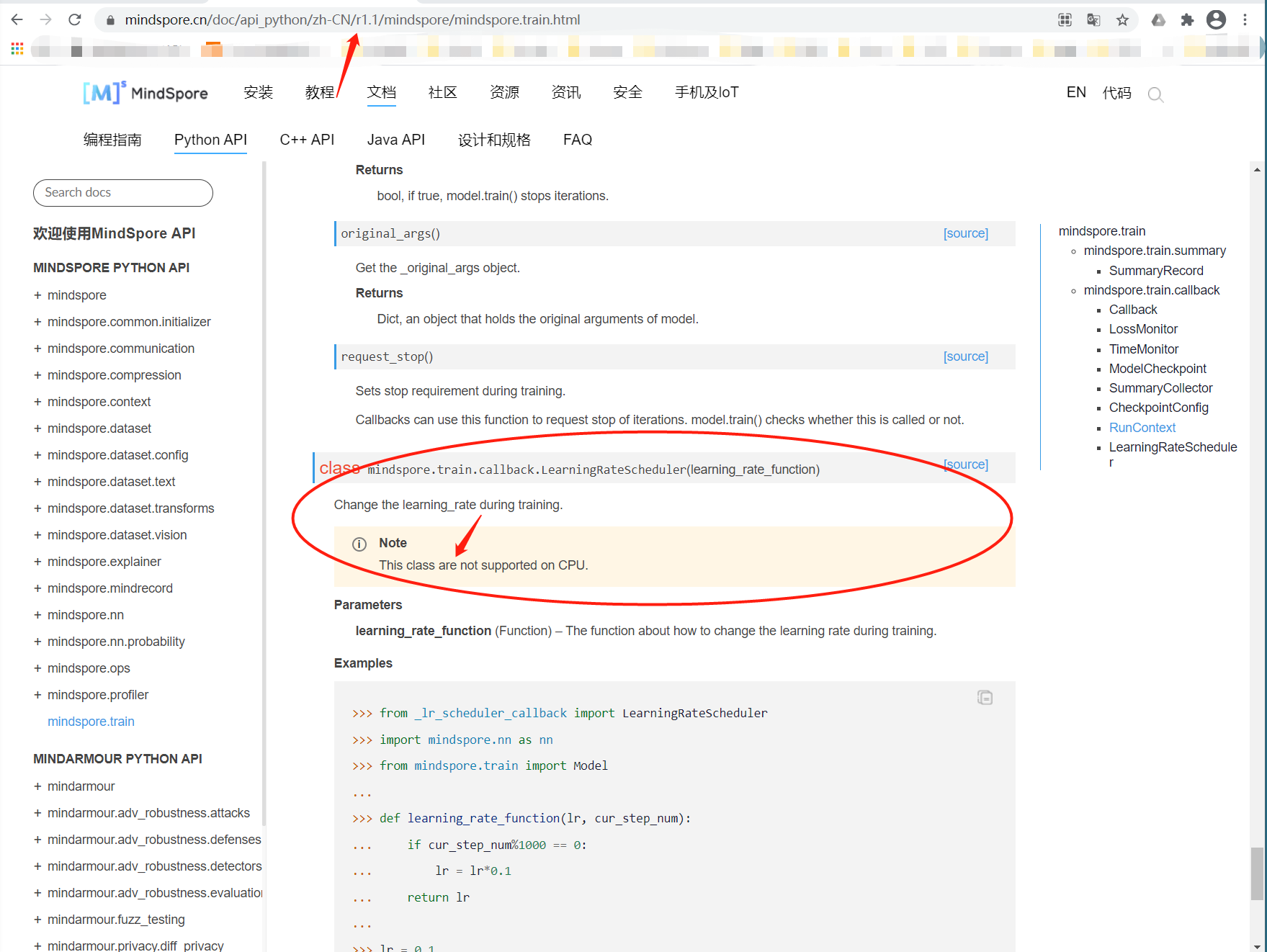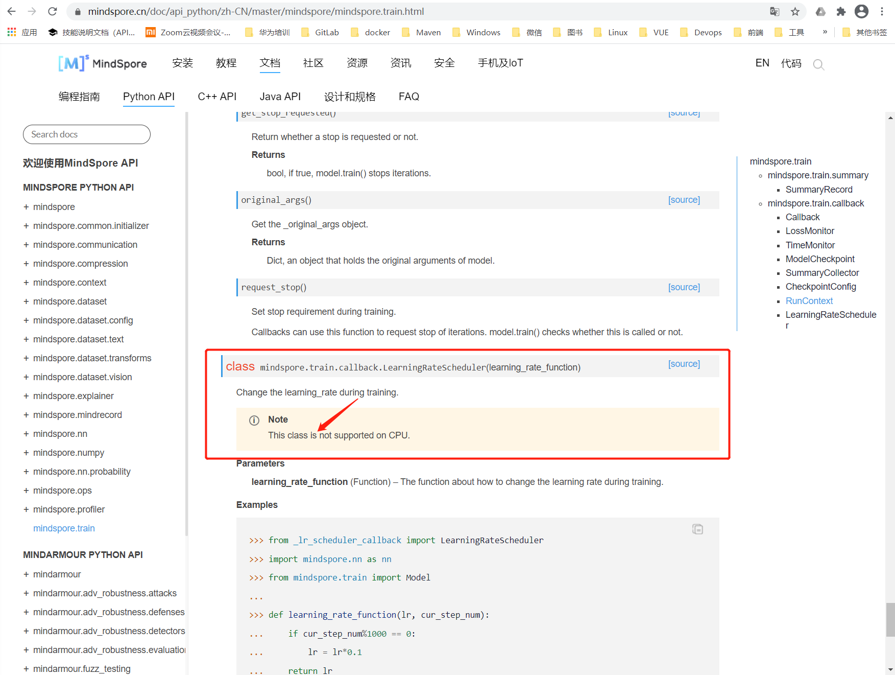 我们再去打开一下原来有bug的那个网页:https://www.mindspore.cn/doc/api_python/zh-CN/master/mindspore/mindspore.train.html