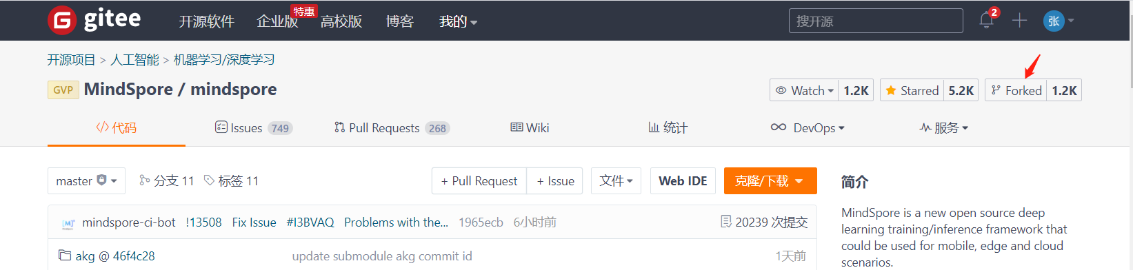 在 https://gitee.com/mindspore/mindspore/ 主仓地址点击 右边的fork按钮(图中因张小白已经fork过了,所以显示的是forked,否则应该是fork)