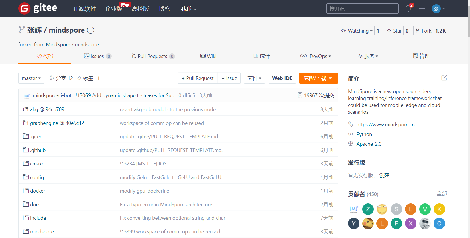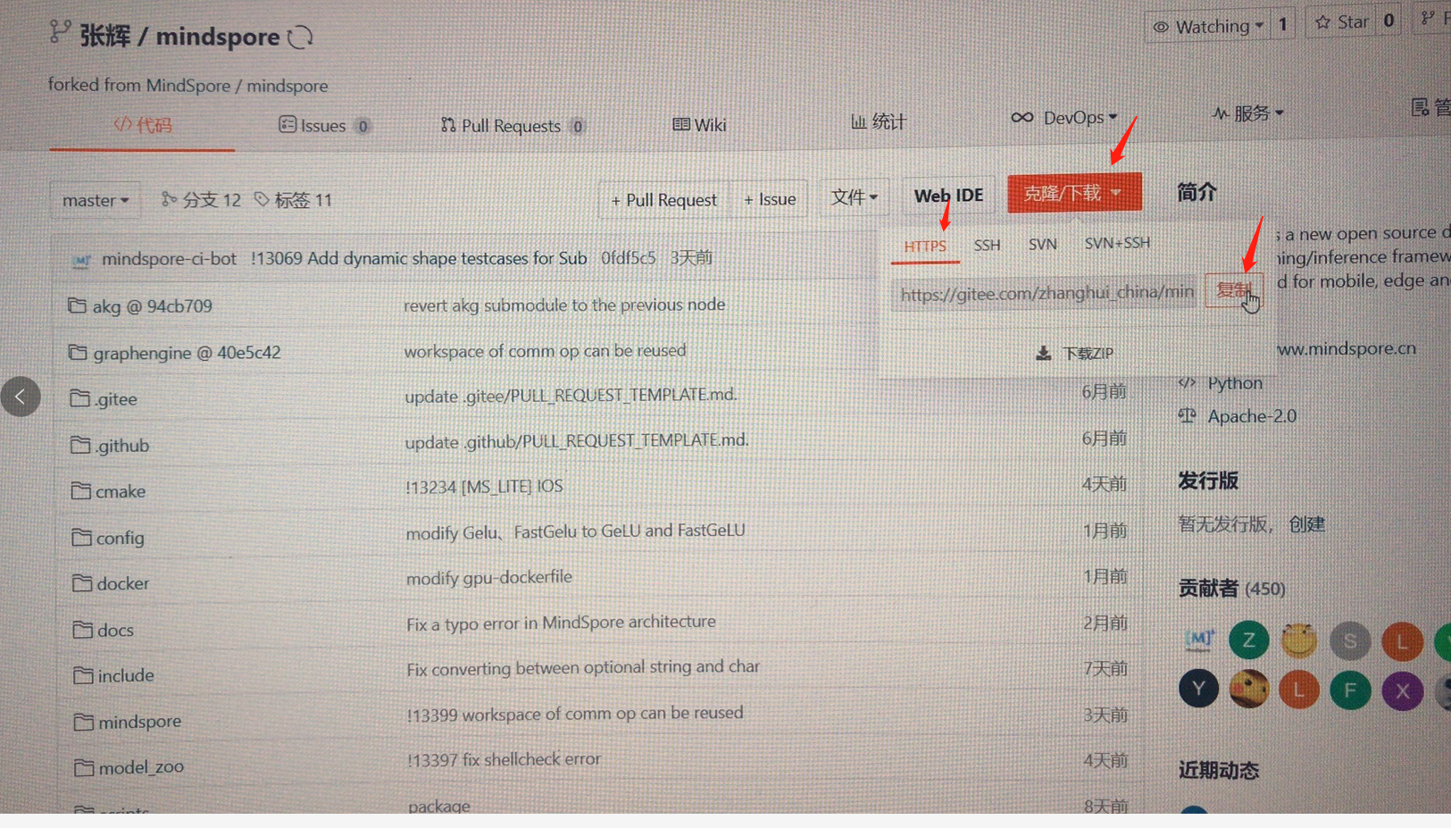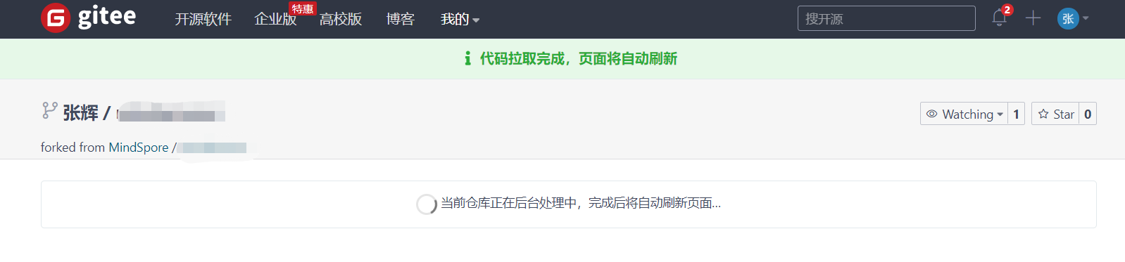 点击大大的“张”(这取决于你注册在gitee的名字),然后点击确认后,系统会将MindSpore的官方仓库复制到用户自己gitee的仓库下,并自动跳转到自己的gitee仓库页面: