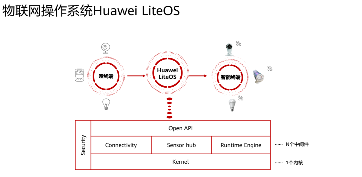Huawei LiteOS基础架构是1+N架构,即1个内核N个中间件。