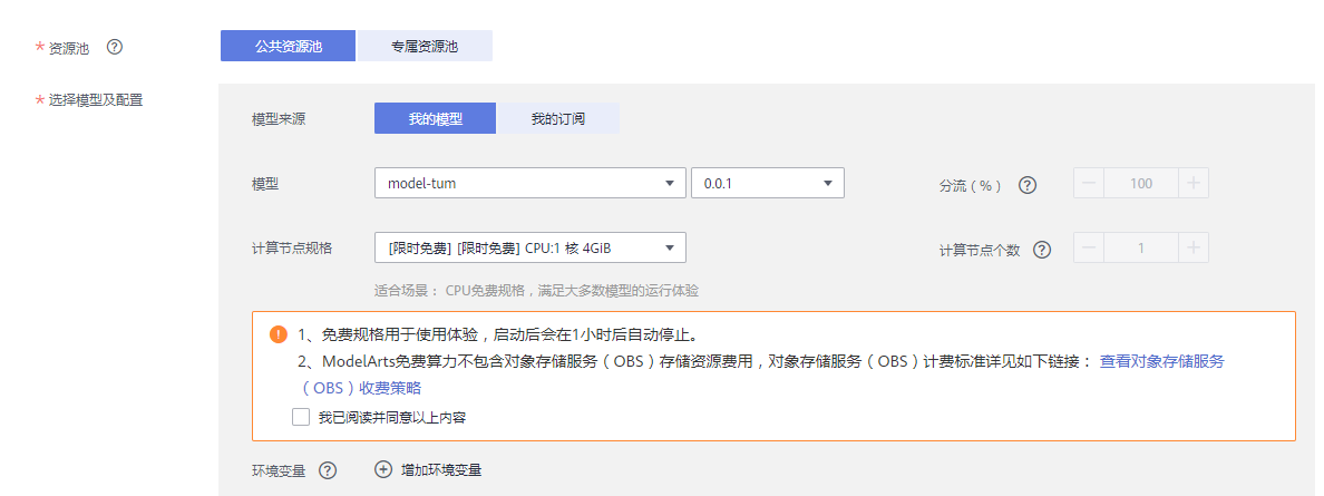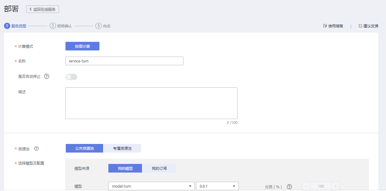点击右面的【部署】然后选择【在线服务】,开始部署服务。在这个页面一样我们设定一个名称,然后在底下的资源池计算节点选择[限时免费]CPU 1核 4G,这个规格即可。