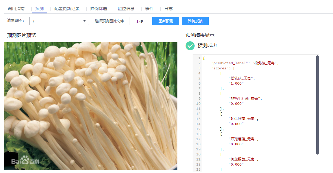 在出来的页面中点击【启动】,状态变成【部署中XX%】就说明系统开始进行部署了。等到状态变为【运行中】就说明服务部署完成了。然后点击页面下面的【预测】,然后点击【上传】上传一张我们自己找的蘑菇图片(这个可以自己百度搜图片,随便找一样蘑菇的图片都可以进行预测)。上传完成后点击预测,页面就会出来预测的结果了。