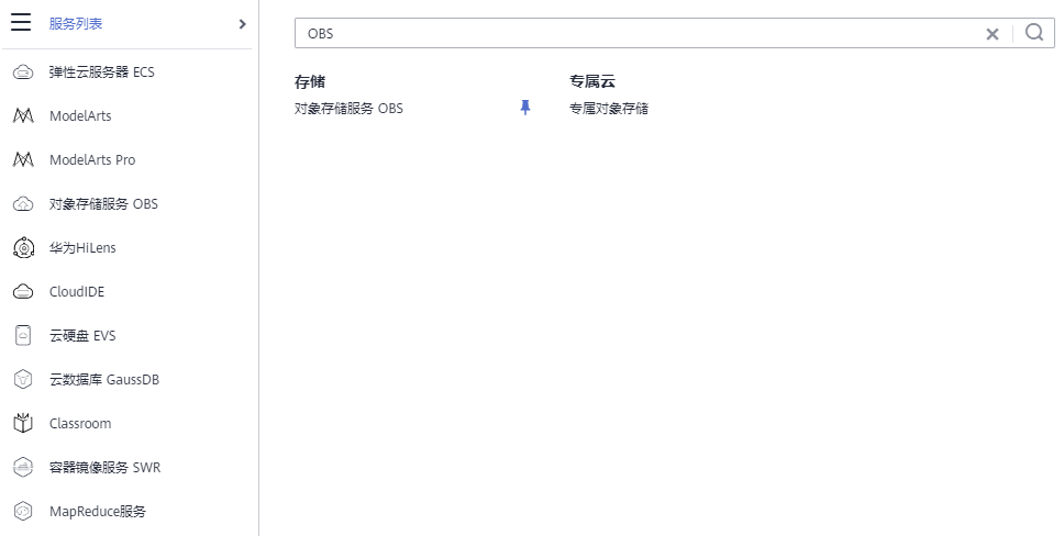 在华为云控制台点击页面左上角的服务列表,然后在搜索中输入OBS,然后在过滤出来的结果中选择对象存储服务进入到OBS界面