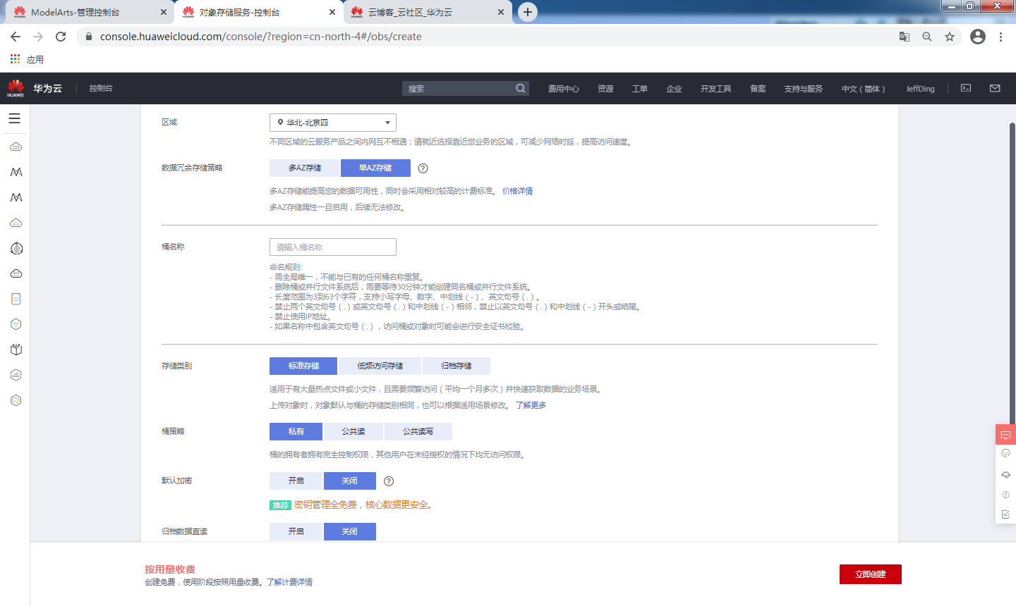 在创建桶的页面中基本保持默认设置即可,在【数据冗余存储策略】选择【单AZ存储】,选择完成后点击立即创建