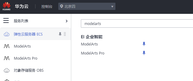 在华为云控制台主页左上角选择【服务列表】,然后在右面的搜索框内搜索ModelArts然后在过滤出来的结果中输入选择【ModelArts】就可以打开ModelArts控制台界面了。