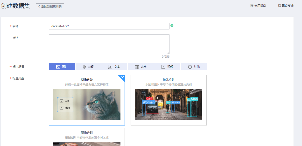 出来的页面中数据集名称自己定义一个,然后标注类型选择图像分类。,然后页面下方的数据集输入位置和数据集输出位置和前面下载数据集的时候一样操作,我们创建两个文件夹一个用于存放输入数据,一个用于存放输出位置。全都完成后点击页面底部的【创建】。数据集的创建就算完成了。