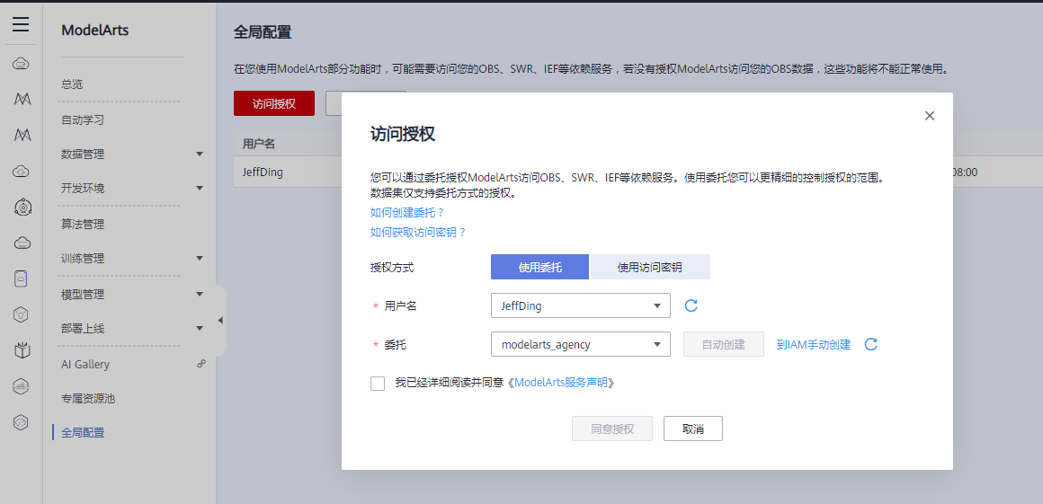 注意:第一次使用ModelArts的话可以需要在ModelArts控制台界面左面找到【全局配置】,然后在出来的界面中选择【访问控制】,随后选择【使用委托】,最后点击【同意授权】完成ModelArts访问OBS等服务的授权操作。