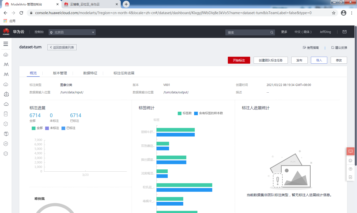 完成导入后,我们在一开始的数据集页面看标注进展总数是6714,已标注:6714就说明我们数据集已经导入完成了。