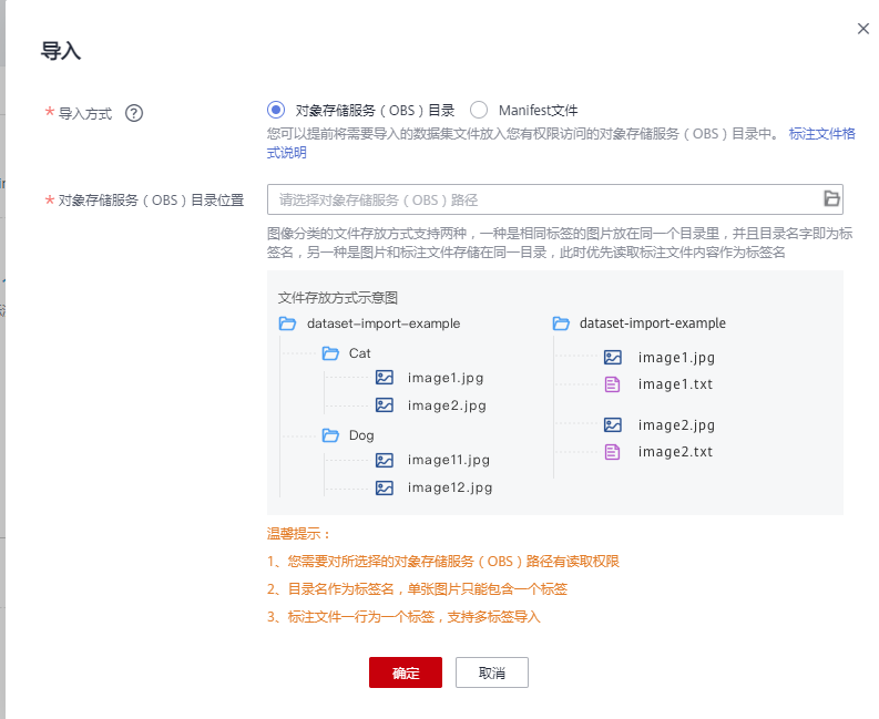 在出来的页面中点击【导入】,然后OBS目录位置选择我们在下载毒蘑菇数据集的时候创建的那个文件夹,然后点【确定】,系统就会自动导入数据。因为数据集准备的时候我已经按照自动标注的要求,进行文件夹命名了,所以在导入完成后ModelArts数据管理也会帮我们自动完成标注。这个过程可能需要20-30分钟的样子。
