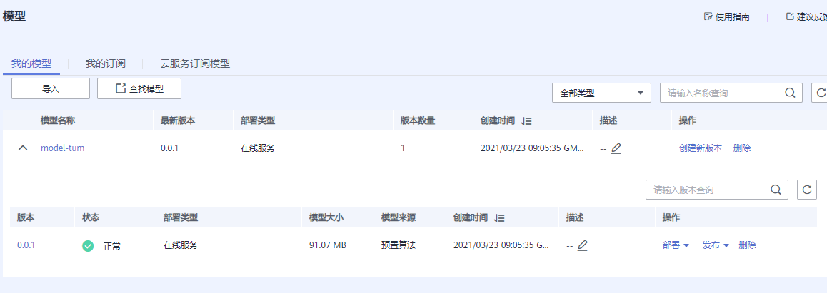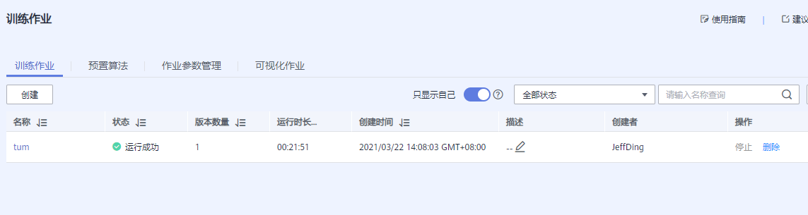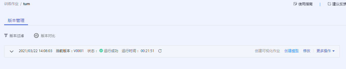 等到训练作业状态显示为运行成功后,我们点击右面的创建模型就可以进行模型创建