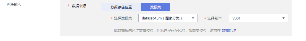 选择完成算法以后,我们还需要选择一下数据来源,这边选择【数据集】,然后【选择数据集】选择我们前面创建发布的数据集即可