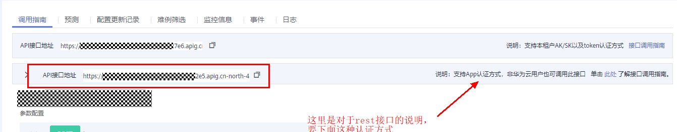 6.服务创建成功后将App认证的REST接口复制出来,注意:这里有两个rest接口,要下面那个接口,上面是aksk认证的接口