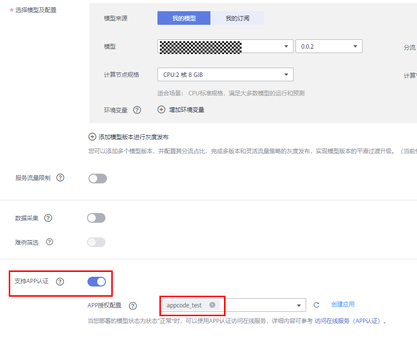 5.在模型部署时开启appcode认证