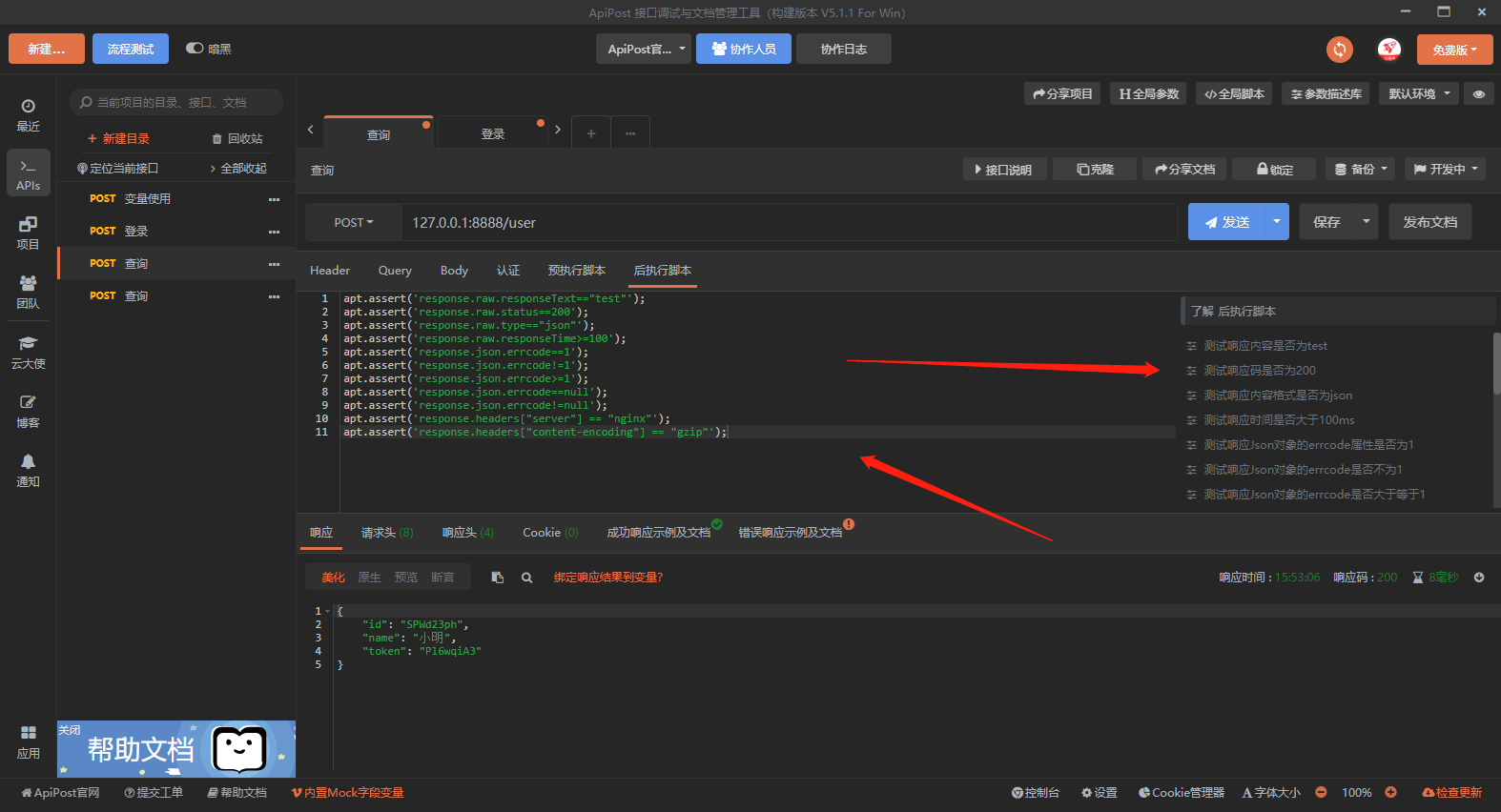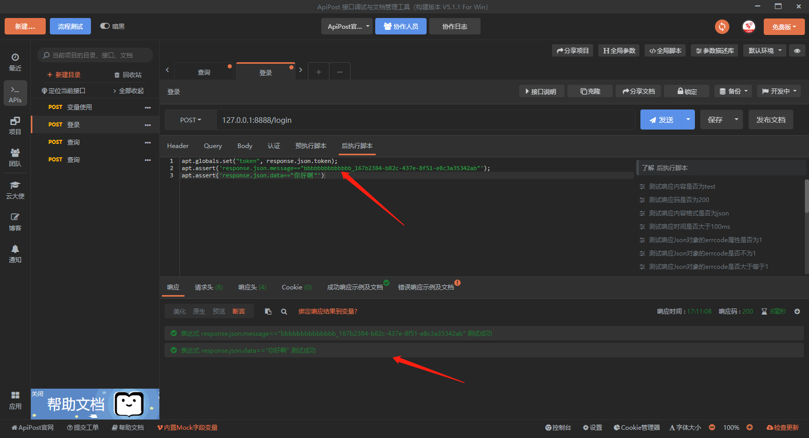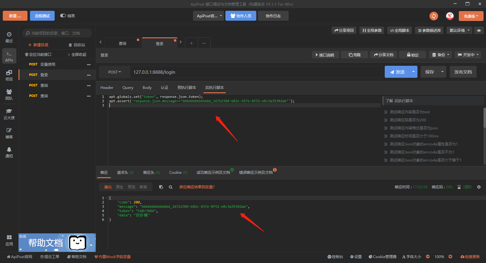 接口测试的时候,有时候会对接口进行断言,apipost在后执行脚本中提供了断言功能