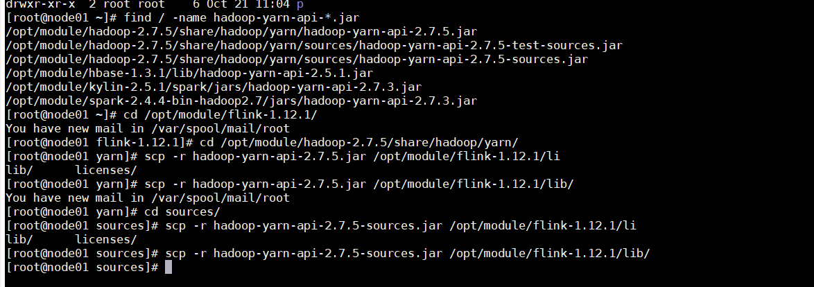 [root@node01 sources]# scp -r hadoop-yarn-api-2.7.5-sources.jar /opt/module/flink-1.12.1/lib/
