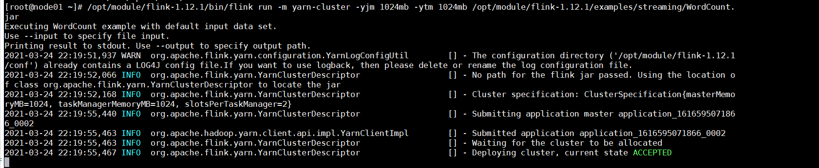 /opt/module/flink-1.12.1/bin/flink run -m yarn-cluster -yjm 1024mb -ytm 1024mb /opt/module/flink-1.12.1/examples/streaming/WordCount.jar