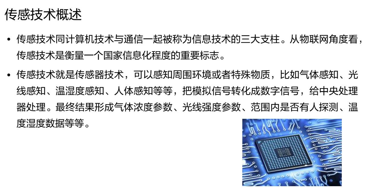 23.传感技术就是传感器技术,可以感知周围环境或者特殊物质,比如气体感知、光线感知、温湿度感知、人体感知等等,把模拟信号转化成数字信号,给中央处理器处理。(True)