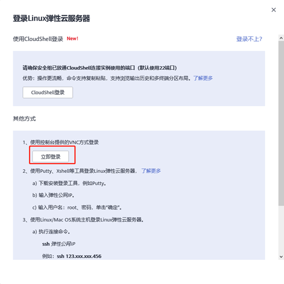 7.可选择不同的方式登录,这里选择VNC方式登录