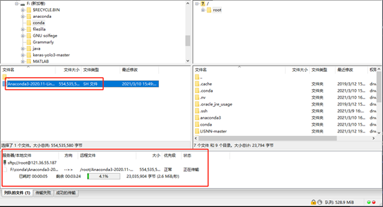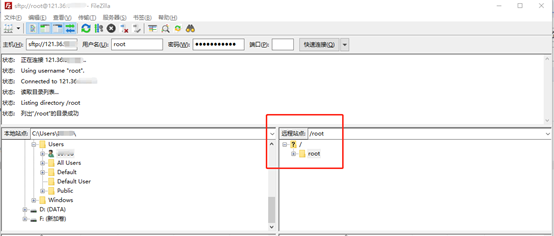 左方“本地站点”是我们本地使用的电脑,而右方“远程站点”则是我们的云服务器,双击选中的文件便可上传到云服务器啦。同样道理,双击远程站点中的文件也可以下载到本地
