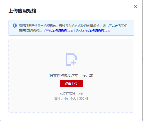 - 导入规格,,目前stage提供两种不同镜像的规格模板:VM镜像-规格模板.zip | Docker镜像-规格模板.zip,可以根据对应的规格模板下载导入,再根据自己的需求进行不同规格的修改