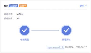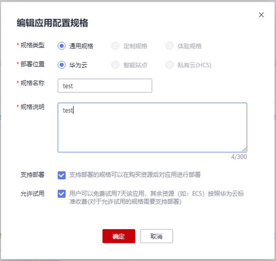 - 新增时,勾选支持部署和试用,方便规格创建完成后进行调试和方案可实施性的验证
