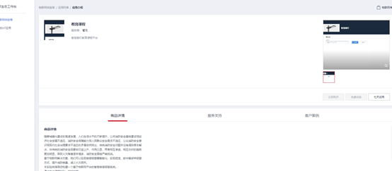 审核通过后,在行业工作台上可以看到已发布的应用,包括审核时填写的商品详情等信息。用户可以通过使用应用体验已上架的一键部署形式,省去自己购买云资源并部署的时间,快速体验应用。