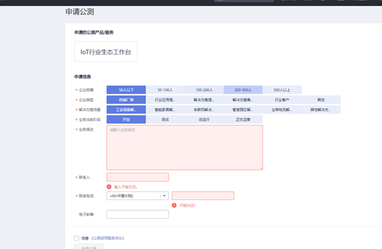 填写申请信息,提交申请公测按钮,通知IoT Stage人员进行审批