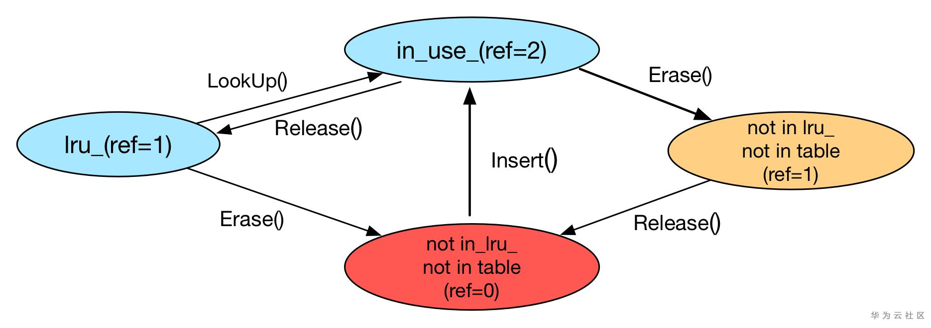 table中,但是仍然被外部 handle 引用且 handle 未释放,因此 ref=1; Erase函数将 entry 从table和in_use中删除,减少一个引用,ref 减 1,但是若此 entry 还被外部 handle 引用,不能直接释放 entry 占用的内存,必须等外部使用者调用Release函数之后才能释放内存;