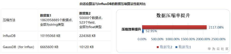 GaussDB(for Influx)对数据采用列式存储,相同类型的数据被集中存储,更有利于数据压缩。采用自研的时序数据自适应压缩算法,在压缩前对数据进行抽样分析,根据数据量、数据分布以及数据类型选择最合适的数据压缩算法。在压缩算法上,相比原生的InfluxDB,重点针对Float、String、Timestamp这三种数据类型进行了优化和改进。