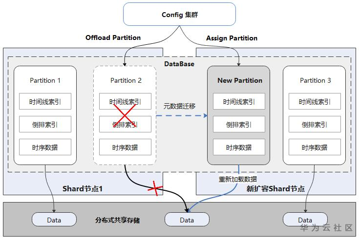 如上图所示,每个Database逻辑上由多个Partition组成,每个Partition独立存储,且都可自描述。所有Partition数据都存储在分布式共享存储上,数据库Shard节点和数据没有物理绑定关系。扩容时首先offload源节点Partition,再在目标节点assign即可。