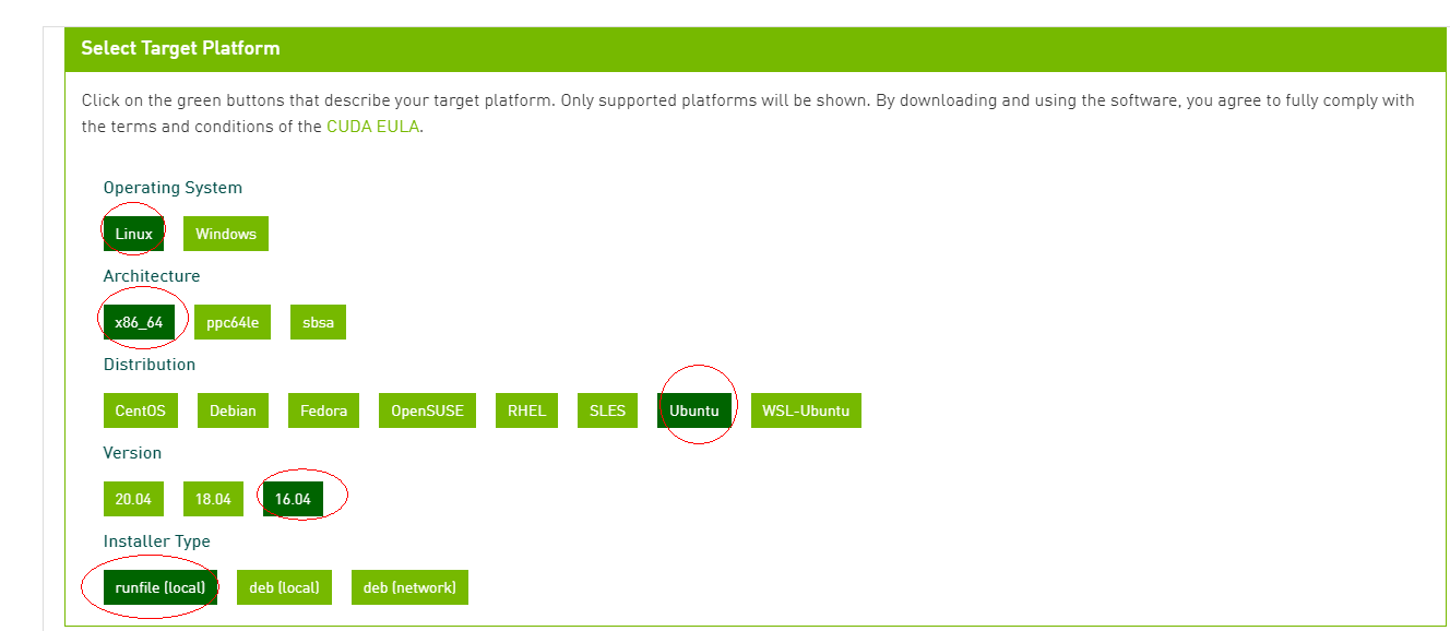 - 下载适配版本的cuda:https://developer.nvidia.com/cuda-downloads?target_os=Linux&target_arch=x86_64&target_distro=Ubuntu&target_version=1604&target_type=runfilelocal