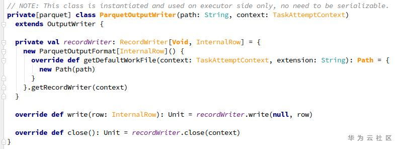 - 在executeTask() -> writeTask.execute()中,先通过outputWriterFactory创建OutputWriter (ParquetOutputWriter):outputWriterFactory.newInstance()。