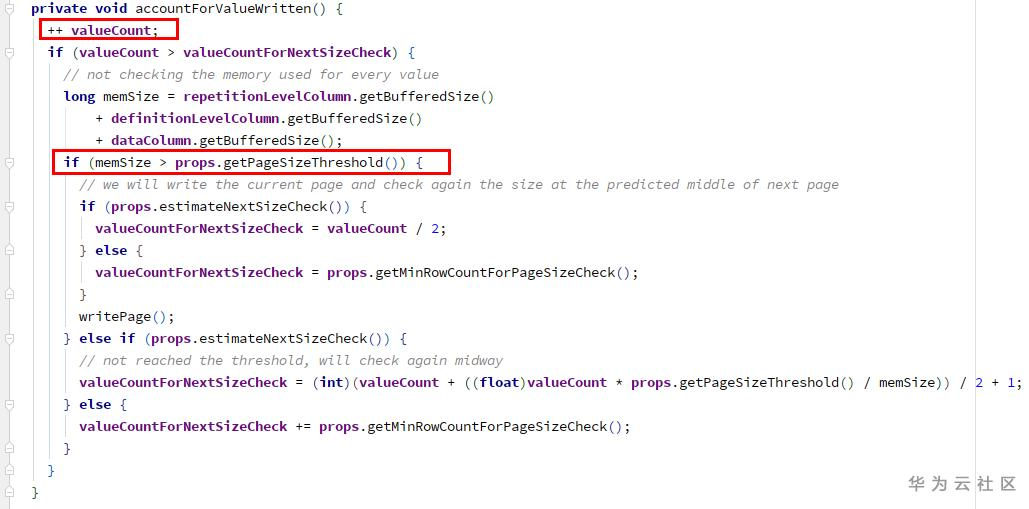 由于写入的值全是null,在1、2两个检查点的memSize都为0,所以不会刷新page和row group。导致的结果就是,一直在往同一个page里增加null值。而ColumnWriterV1的计数器valueCount是int类型,当超过int.max时,溢出,变为了一个负数。