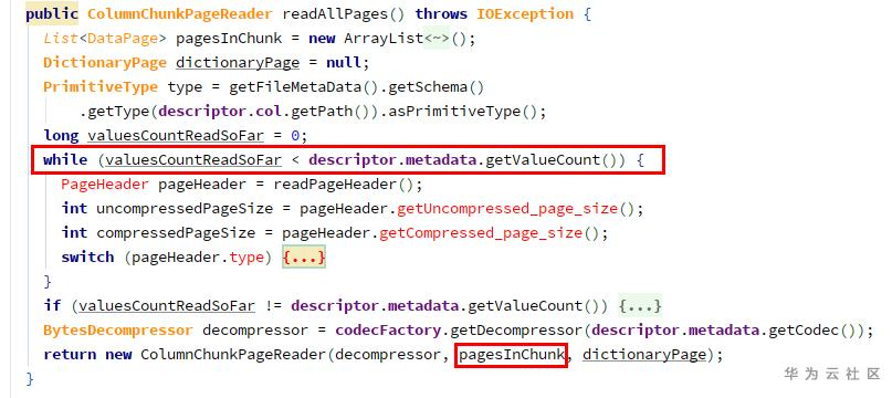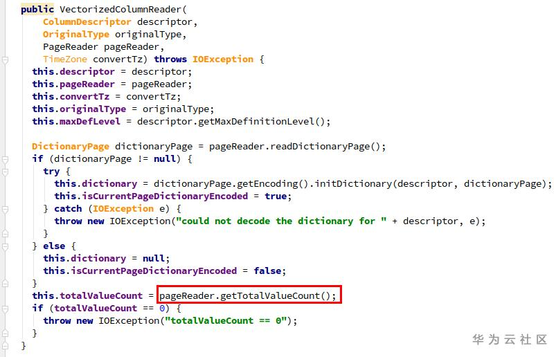 初始化阶段:ParquetFileFormat.BuildReaderWithPartitionValues -> VectorizedParquetRecordReader.initialize -> ParquetFileReader.readFooter -> ParquetMetadataConverter.readParquetMetadata -> fromParquetMetadata -> ColumnChunkMetaData.get,其中包含valueCount(为0)。